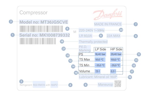 کمپرسورهای منیروپ دانفوس در چهار سری تولید میشوند که در ایران، سریهای MT، NT و MTZ به کار گرفته میشوند. از مزایای کمپرسور منیروپ دانفوس میتوان به صدا، لرزش و مصرف برق پایین اشاره کرد. در ادامه، نحوه پلاک خوانی کمپرسور منیروپ دانفوس شرح داده شده است.
