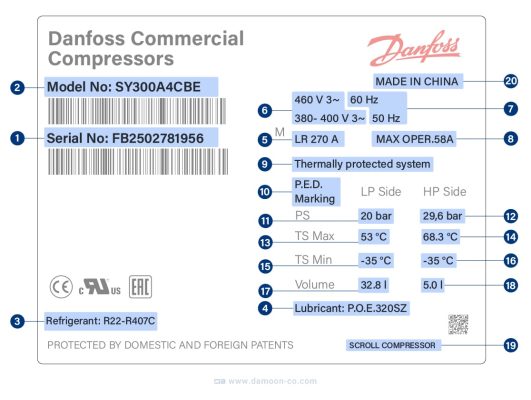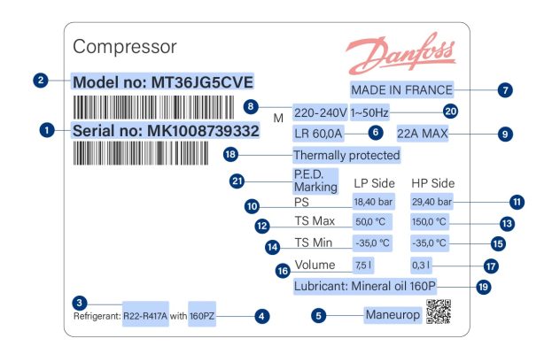 ۱-سریال کمپرسور: هر کمپرسور دانفوس دارای یک شماره سریال اختصاصی است که به وسیله آن میتوان از اصالت کالا اطمینان حاصل نمود.