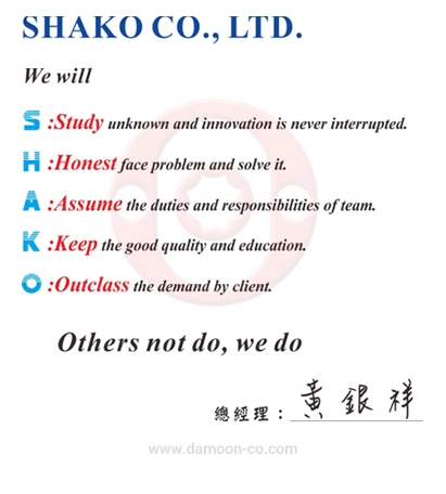 شرکت شاکو SHAKO بزرگترین تولید کننده محصولات مرتبط با صنعت پنوماتیک در تایوان است. این شرکت از زمان آغاز فعالیت در 1980 تاکنون با توجه به تحقیقات میدانی و رویکردی مشتری مدارانه موفق به کسب جوایز و استانداردهای متعدد شد. با پیگیری مستمر در زمینه فناوریهای پیشرفته در صنعت پنوماتیک، شرکت SHAKO جایگاه پیشرو خود را در تولید صنعتی حفظ کرده است. در خظ تولید آن ماشینآلات پیشرفته تراش و فرز به کار گرفته شدهاند و از تأمین مواد اولیه تا محصول نهایی و مونتاژ، تمامی مراحل بهصورت کاملاً خودکار و تحت کنترل رایانه انجام میشود تا کیفیت محصول بهبود یابد و بهرهوری تولید و تحویل بهطور مداوم افزایش یابد.