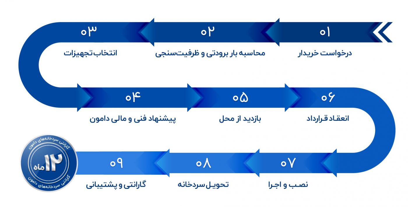 | سردخانه صنعتی | ۷۰۰ تا ۳۵۰۰ | ۱۰۰۰ تا ۵۰۰۰ | ۱۶۰ تا ۶۰۰ | ۶۰ تا ۹۰ روز کاری |