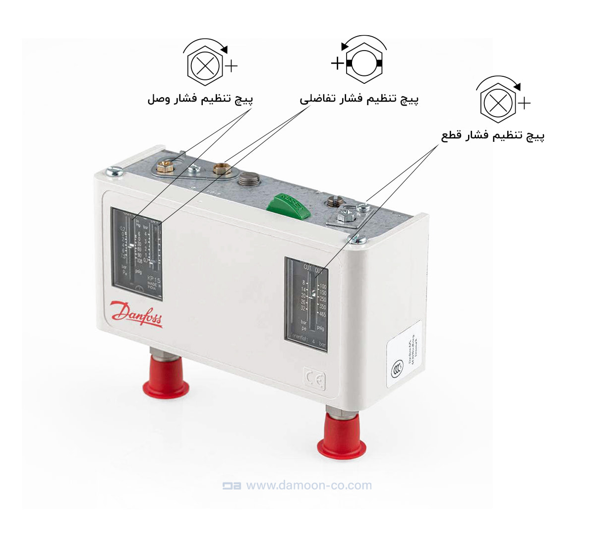 تنظیم پرشرسوییچ دانفوس با تنظیم کردن پیچهای تنظیم فشار CUT IN، CUT OUT و DIFF انجام میشود. هر یک از پیچها میتوانند بر روی هرکدام از پرشرسوییچها -با توجه به نوع آن- قرار داشته باشند. در تصویر زیر هر کدام از این پیچها نمایش داده شده است.