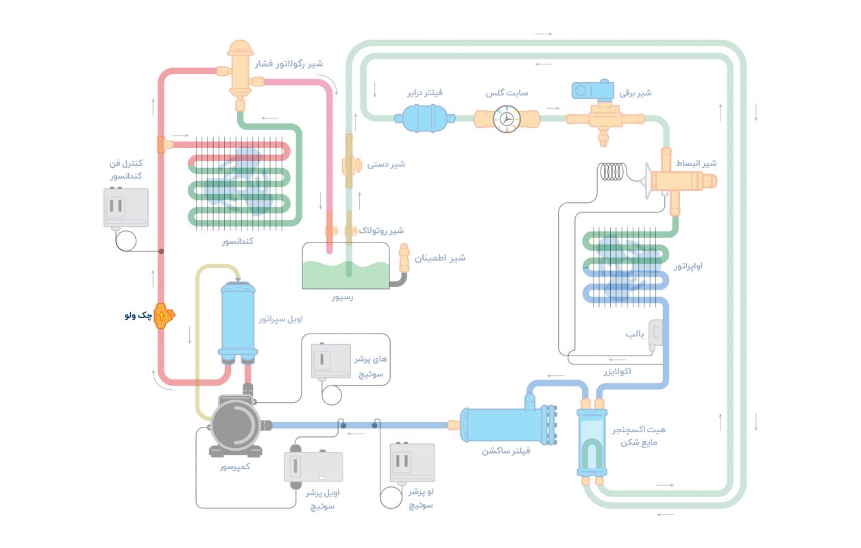 چک ولو یا شیر یک طرفه شیری است که صرفا اجازه حرکت مبرد در یک جهت را میدهد و زمانیکه سیال خلاف آن جهت حرکت کند بسته میشود؛ به همین دلیل این شیر بهعنوان شیر یک طرفه یا شیر بدون بازگشت نیز شناخته میشود. کارکرد اصلی شیر یک طرفه، ممانعت از بازگشت مبرد به سیستم است؛ به این ترتیب میتوان گفت یکی از کمهزینهترین و سادهترین راهها برای جلوگیری از بهوجود آمدن آسیبهای جدی در سیکل تبرید، بهرهگیری از این شیر پرفایده است.