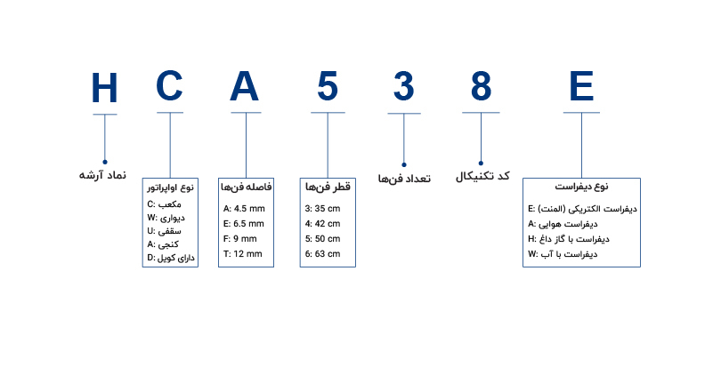 بخشهای مختلفی که در نام هر مدل اواپراتور بیان میشود، یک ویژگی خاص را شرح میدهد. در تصویر زیر، نام یکی از مدلهای این اواپراتور شرح داده شده است.
