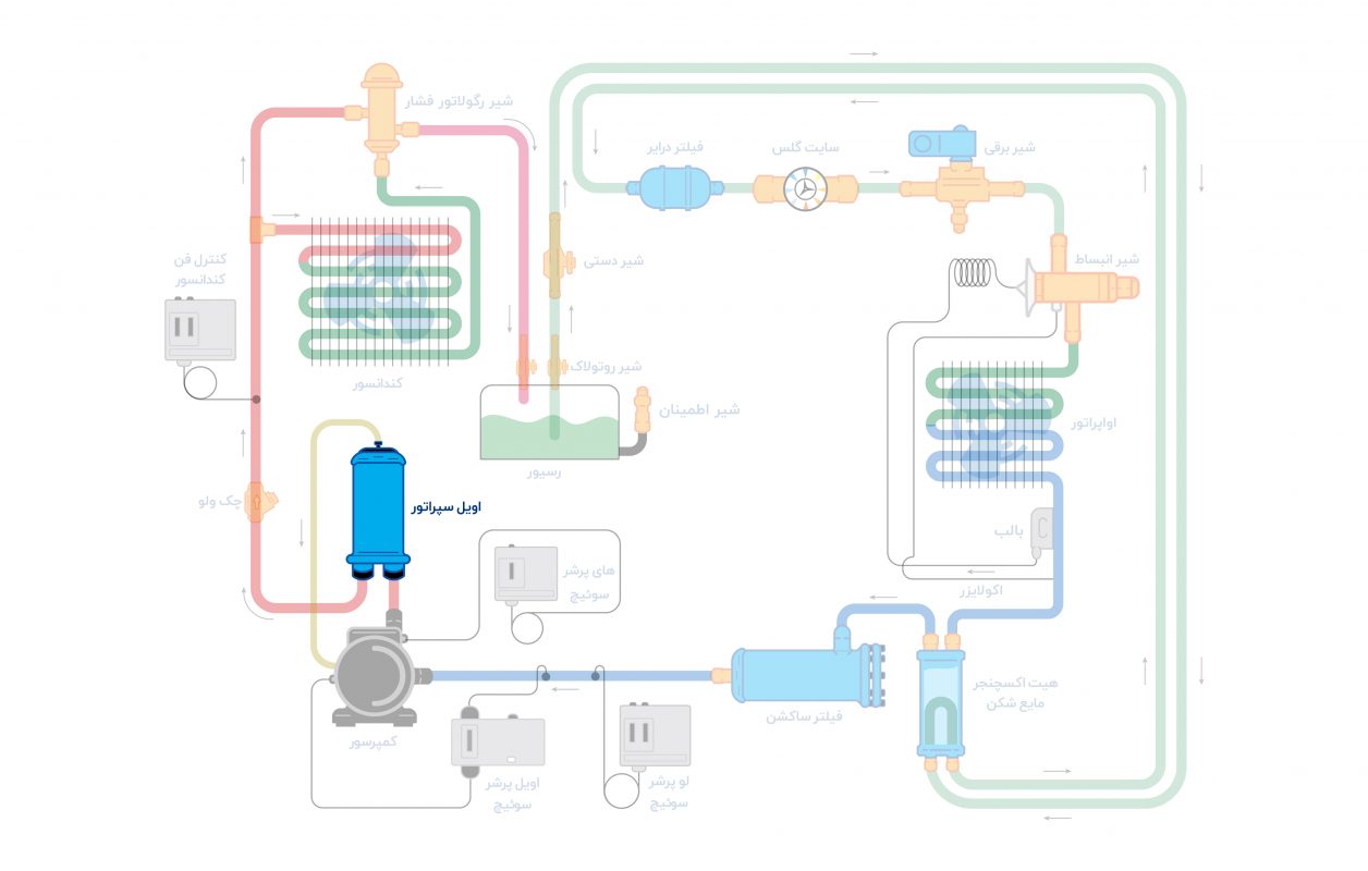 اویل سپراتور بهصورت عمودی در خط دهش یا همان خروجی کمپرسور نصب میشود. برای عملکرد بهتر اویل سپراتور باید آن را در نزدیکترین فاصله از کمپرسور قرار داد اما بازگشت مبرد از کندانسور به آن نیز میتواند عملکردش را مختل کند. بنابراین، برای مواقعی که کندانسور بالاتر از اویل سپراتور قرار دارد بهتر است بین آن و کندانسور از شیر یکطرفه استفاده شود.