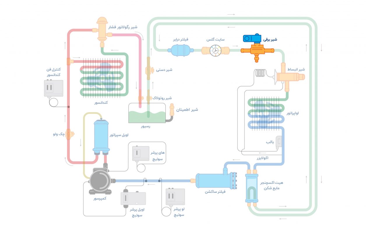 سلنوئید ولو میتواند در نقاط مختلف سیکل تبرید جهت قطع و وصل جریان بهکار گرفته شود اما این تجهیز معمولا در خط مایع، قبل از شیر انبساط و پس از کندانسور نصب میشود. در تصویر زیر میتوان محل قرارگیری شیر برقی را در سیکل تبرید مشاهده کرد.
