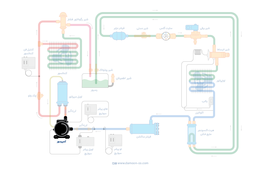 محل نصب کمپرسور سمی هرمتیک بوک بعد از اواپراتور و پیش از کندانسور میباشد. در تصویر زیر میتوان محل دقیق را مشاهده کرد.