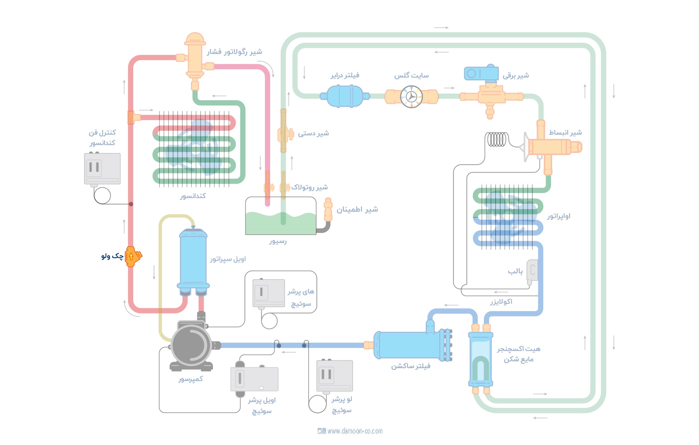 این تجهیز در مسیر خروجی کمپرسور یا همان خط دهش، قبل از کندانسور و بعد از اویل سپراتور قرار دارد.