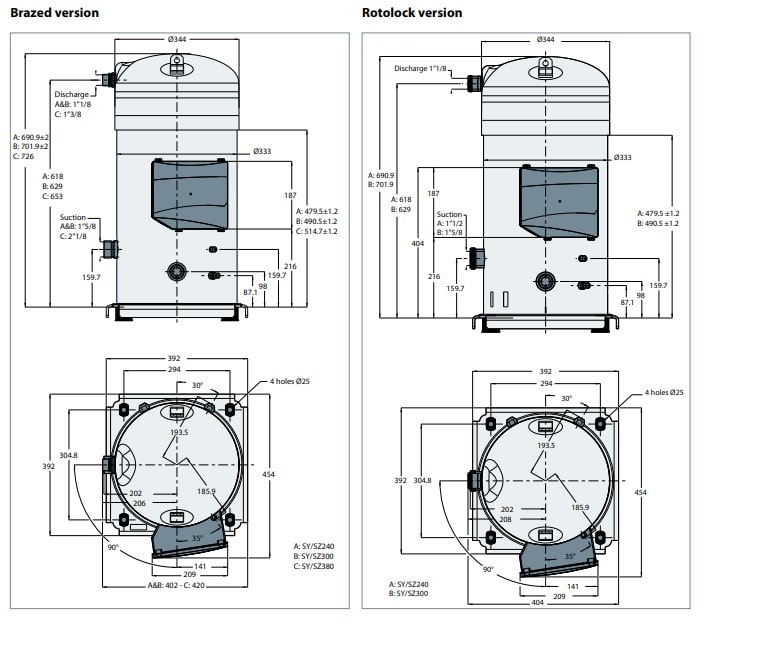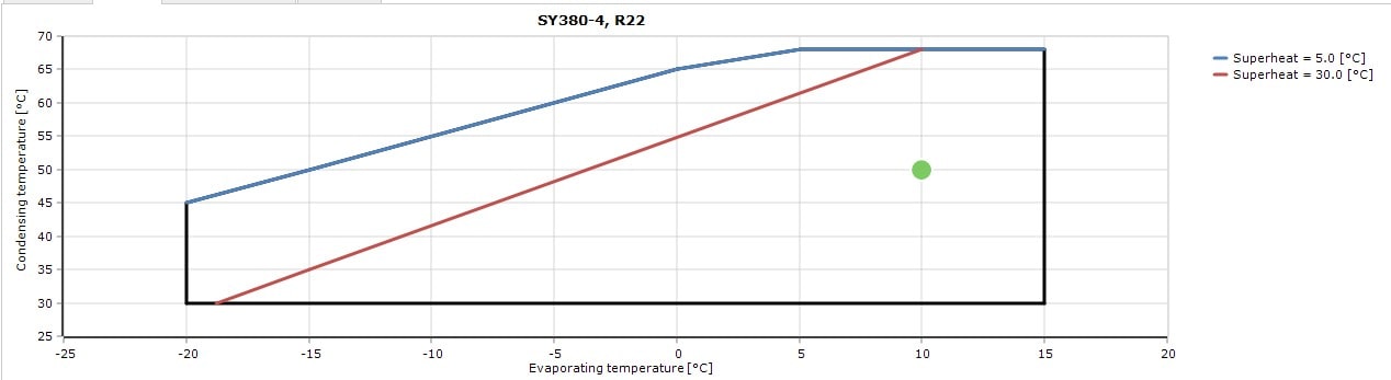 کمپرسور SY380 دارای توان 31.6 اسب بخار است و برای کارکرد در دماهای 15- تا 15+ درجه سانتیگراد طراحی شده است. این کمپرسور در دماهای بالا و پایین اواپراتور کارکرد مناسبی از خود نشان خواهد داد. گاز سازگار با این کمپرسور R22 ,R407C ,R134a است که با 8.4 لیتر روغن پلی ال استر یا POE مدل 320SZ کار میکند.